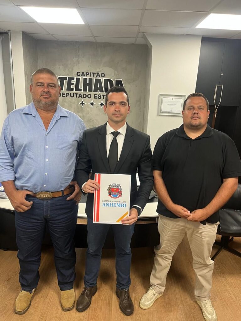 Lideranças políticas de Anhembi estiveram na Assembleia Legislativa do Estado de São Paulo (Alesp) na terça-feira, 25 de novembro, para uma reunião com o deputado estadual Capitão Telhada (PP-SP). Participaram do encontro o vereador Rogerião Winckler (PL), o vereador Ivan Chiquito (União Brasil) e o diretor da EMEF Professora Olinda Rafael Miranda. A comitiva levou ao parlamentar um conjunto de solicitações consideradas prioritárias para o município.