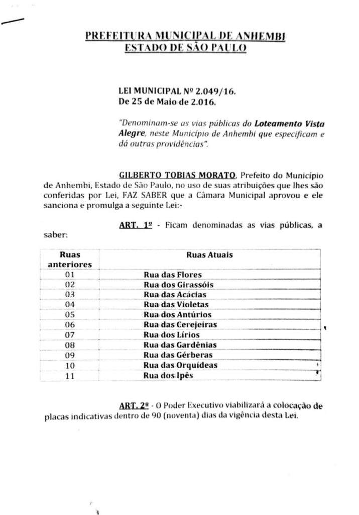 A vereadora mencionou o conteúdo da Lei nº 2.049/16, que denomina as vias públicas do loteamento Vista Alegre. Entre os nomes oficiais, estão Rua das Flores, Rua dos Girassóis, Rua das Acácias, Rua das Violetas, Rua dos Antúrios, Rua das Cerejeiras, Rua dos Lírios, Rua das Gardênias, Rua das Gérberas, Rua das Orquídeas e Rua dos Ipês.