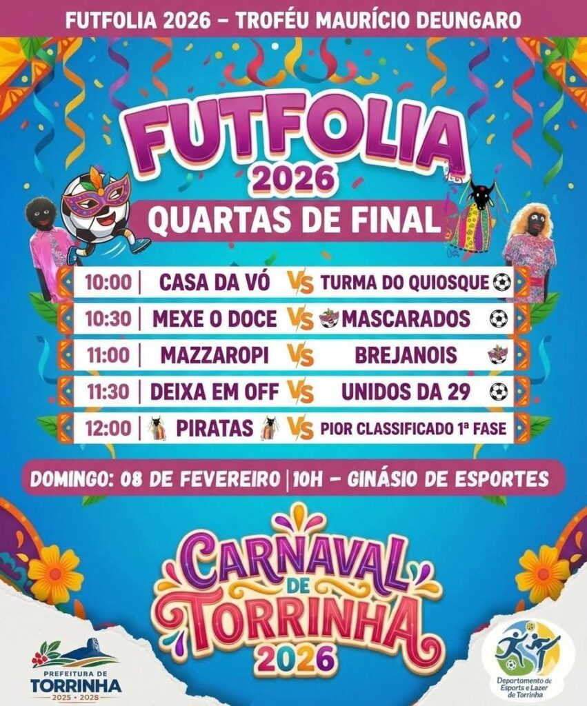 O Departamento de Esporte e Lazer realizou, no dia 14 de janeiro, quarta-feira, no Ginásio de Esportes, o Congresso Técnico e o sorteio das equipes do FutFolia 2026. O encontro contou com a presença dos representantes das nove equipes participantes, marcando oficialmente o início da organização do tradicional torneio que une esporte e carnaval em Torrinha.