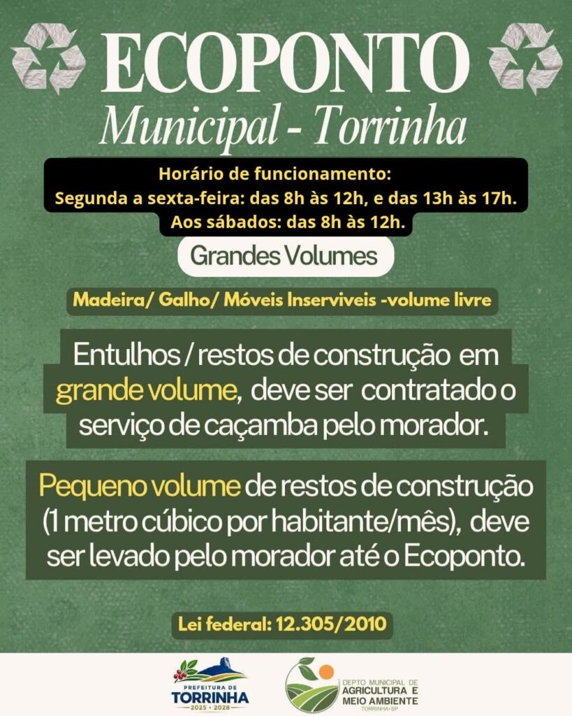 A Prefeitura de Torrinha reforça à população a importância do uso adequado do Ecoponto Municipal, espaço criado para garantir o descarte correto de resíduos e contribuir diretamente para a preservação do meio ambiente, a saúde pública e a organização da cidade.