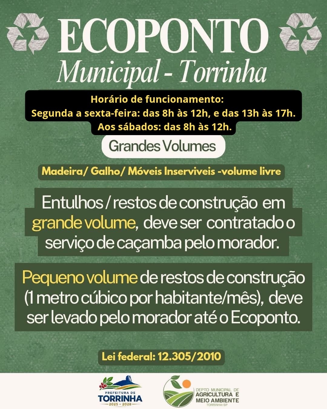 A Prefeitura alerta que resíduos de construção em grande volume (entulho) não são recolhidos pelo Ecoponto. Nesses casos, conforme determina a legislação, o munícipe deve contratar serviço particular de caçamba para a destinação correta do material.