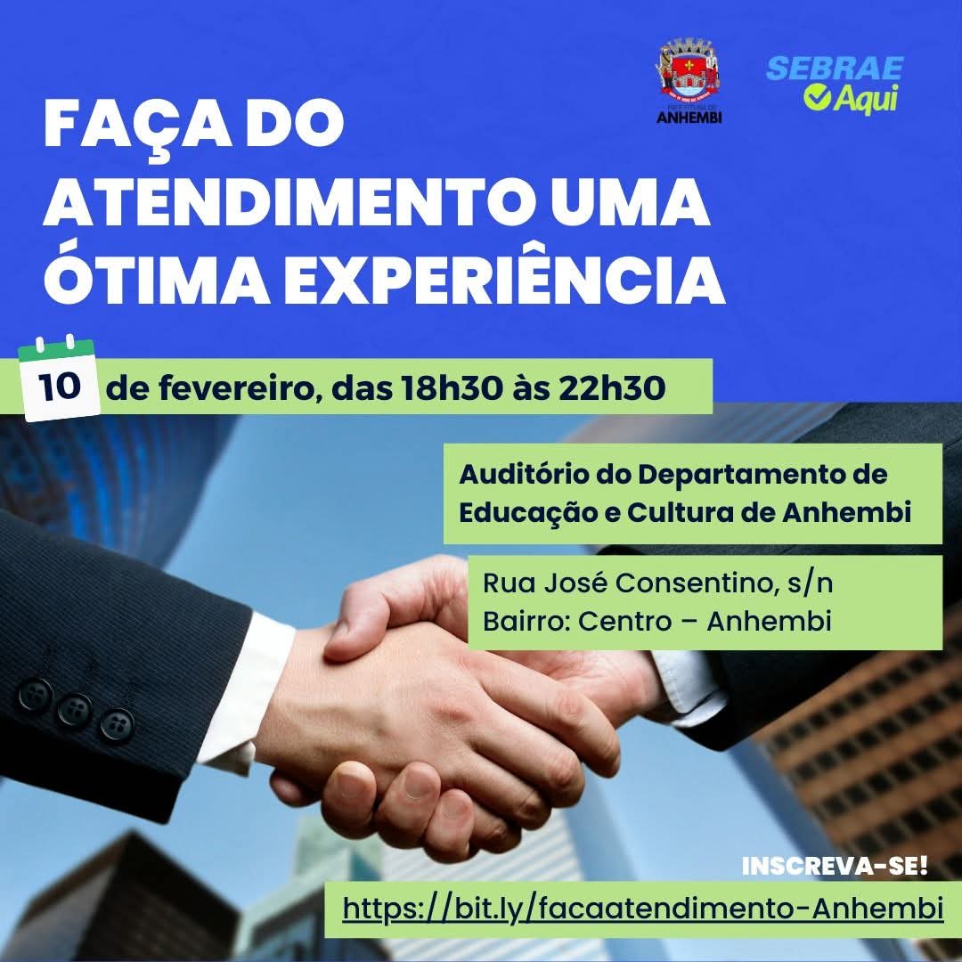 Com o objetivo de qualificar profissionais e aprimorar a relação entre prestadores de serviço e clientes, o município de Anhembi receberá o curso “Faça do Atendimento uma Ótima Experiência”, que será realizado no dia 10 de fevereiro, das 18h30 às 22h30, no Auditório do Departamento de Educação e Cultura.