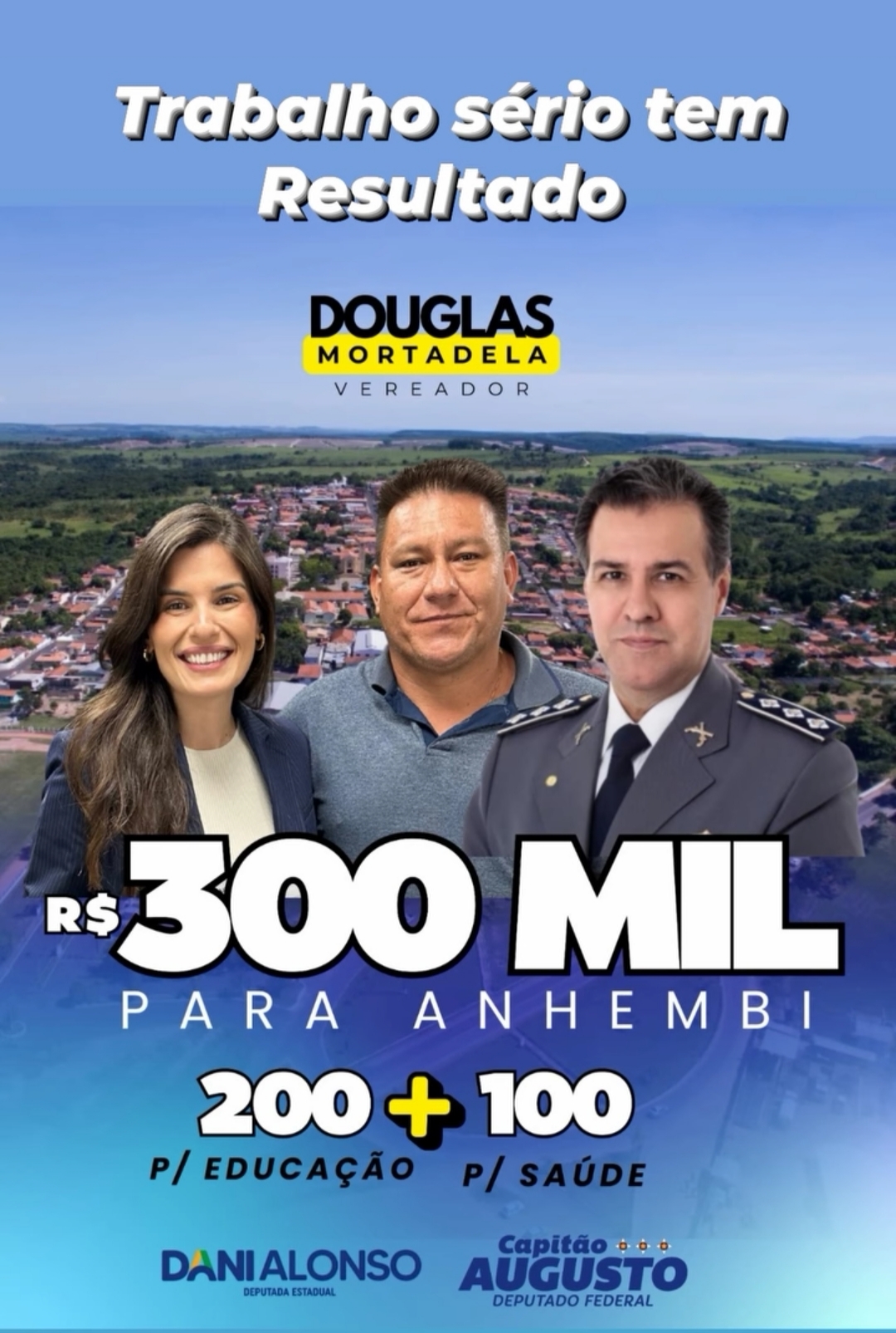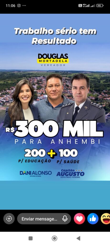 - Em seu discurso, o Vereador Douglas Mortadela expressou sua gratidão aos Deputados Capitão Augusto e Dani Alonso pelo apoio e pelo compromisso com a população de Anhembi. “Essas emendas são de suma importância para o desenvolvimento de nossa cidade, trazendo recursos para áreas essenciais como educação, saúde e infraestrutura”, destacou o vereador. “Agradeço imensamente aos deputados por atenderem ao nosso pleito e por demonstrarem, mais uma vez, o compromisso com Anhembi”.