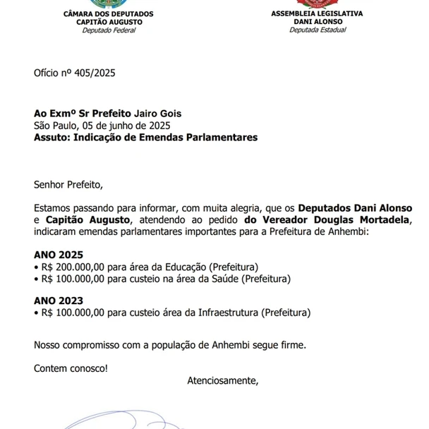 No documento, datado de 05 de junho de 2025, os deputados confirmam a indicação de importantes emendas parlamentares para a Prefeitura de Anhembi, atendendo a um pedido do próprio Vereador Douglas Mortadela.