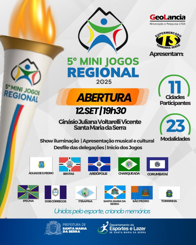 Santa Maria da Serra será palco do maior evento esportivo da região: os 5º Mini Jogos Regionais da Serra do Itaqueri, que reunirão atletas de 9 a 70 anos em 24 modalidades esportivas. A competição contará com a participação de 11 cidades: